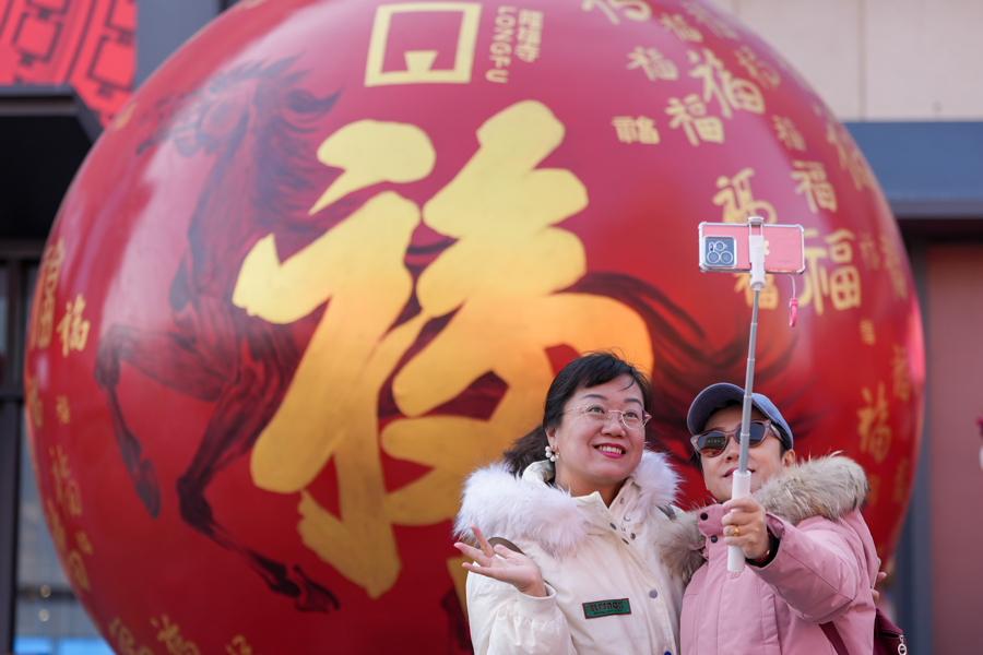 游客在北京市东城区2026隆福寺新春市集游玩自拍。鞠焕宗摄。
