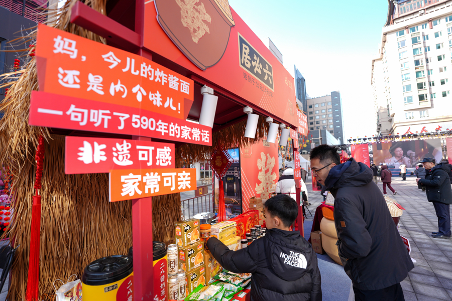在北京市东城区2026隆福寺新春市集,市民带着孩子在六必居摊位前选购商品。鞠焕宗摄。